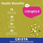 - CRISTA Coriander is of premium quality, featuring a robust and sweetly aromatic profile.
