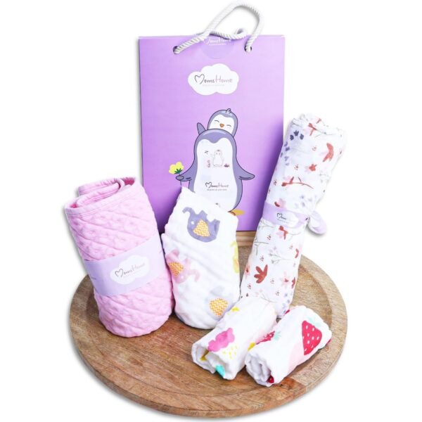 MOM’S HOME Organic Cotton Baby Bath Set | 5 – Piece Towel & Swaddle Combo | Baby Shower Gift for Girls | 0-1 Year Essentials Hamper – Fast Shipping to USA & Canada