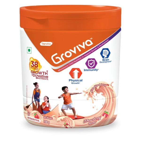 Groviva Milk Protein Powder for Kids 2-6 years | 38 Growth & Digestive Nutrients | Supports Physical Growth, Brain Development & Immunity Jar, 200g – (Strawberry) – Fast Shipping to USA & Canada