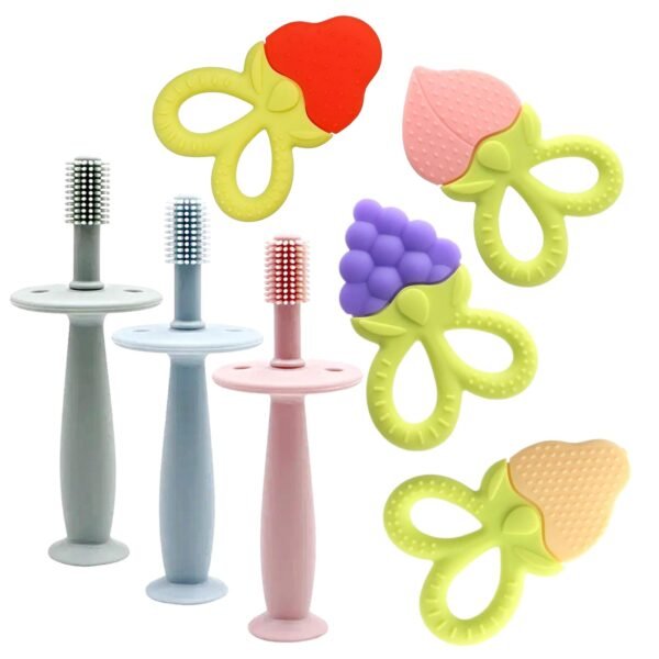 MOM CARE Silicone Baby Teether for Teething Gums,Fruit & Teething Brush with Textured Surface for Infants and Babies, 100% Food Grade Silicone, Tooth Brush Design, (Random Color) Pack of 2 – Fast Shipping to USA & Canada