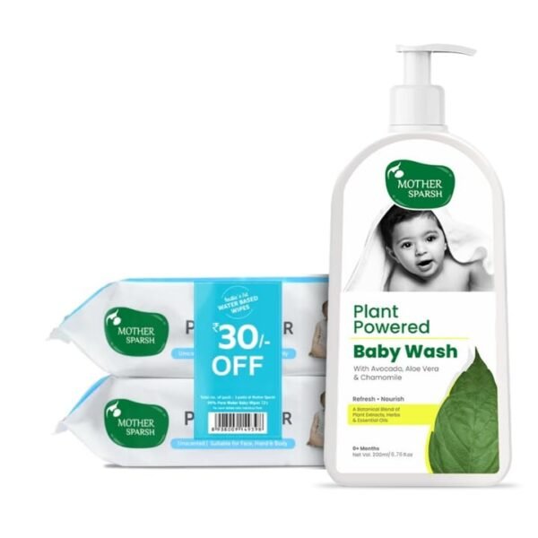 Mother Sparsh Plant Powered Natural Baby Wash, 200 ml + 99% Pure Water (Unscented) Baby Wipes- Super Thick I 72 pc/Pack – Pack of 2 – Fast Shipping to USA & Canada
