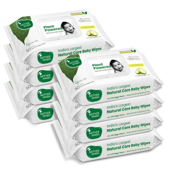 Mother Sparsh Natural Care Baby Wipes 60 Pcs (Pack of 8) I 100% Plant Made Fabric From Forest Land | Fresh+Cleanse (with Cucumber) Plant Powered Wet Wipes For Baby I Cotton Cloth Like Bigger Sheets – Fast Shipping to USA & Canada
