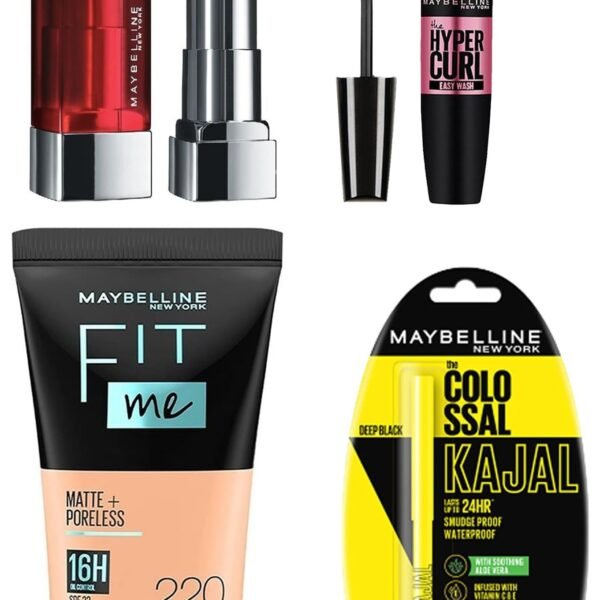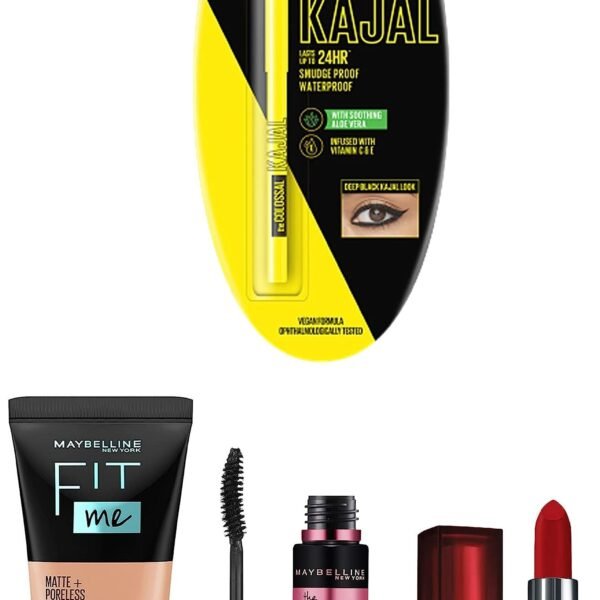 Maybelline New York Date Night Makeup Kit – Fit Me Foundation Tube Natural Beige + Hypercurl Mascara Washable + Colossal Kajal + Creamy Matte Siren In Scarlet, 1 Count – Fast Shipping to USA & Canada