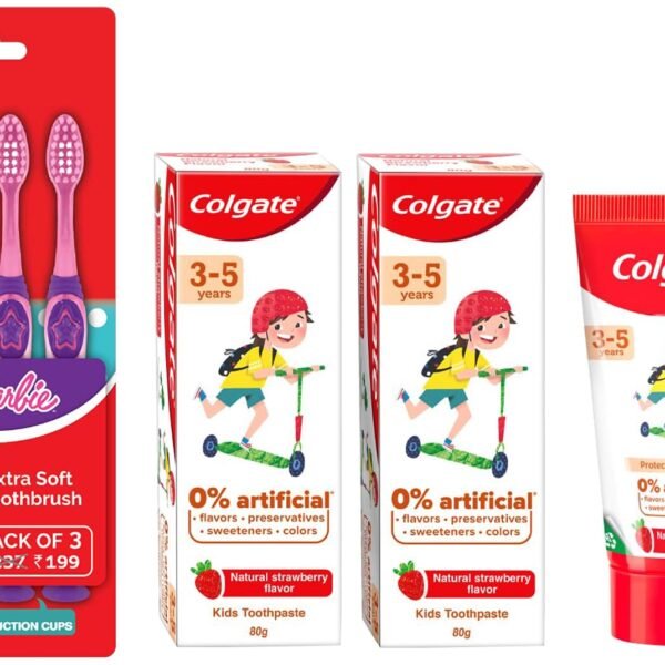 Colgate Kids 3-5 yrs premium Toothpaste, Natural Strawberry Flavour Tooth Paste with 0% Artificial Flavors (160g, Pack of 2) & Colgate Kids Barbie Toothbrush Extra Soft with Tongue Cleaner (Pack of 3) – Fast Shipping to USA & Canada