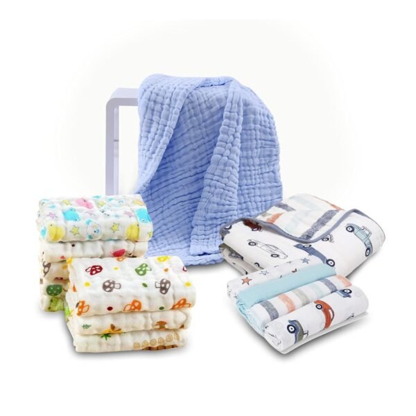 MOM’S HOME Organic Muslin New Born Baby Gift Set – Blue White – 9 Items – Pack of 4 Swaddle, Pack of 5 Muslin Napkin – Fast Shipping to USA & Canada