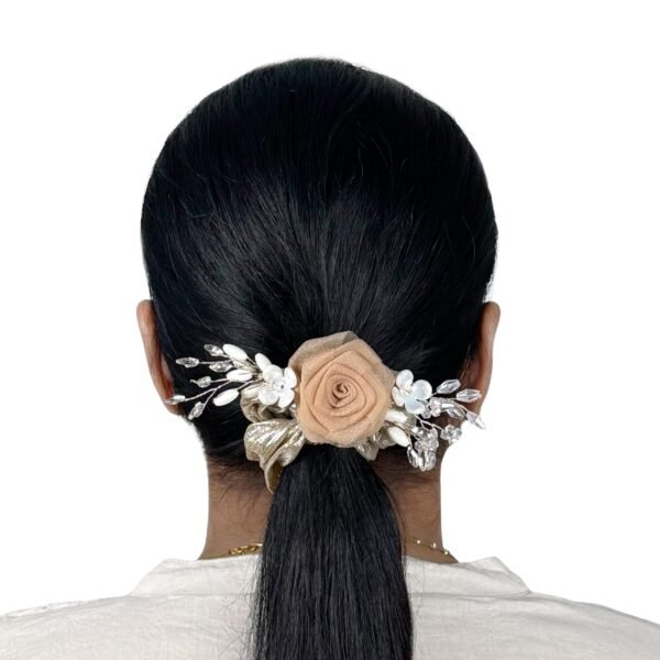 Pretty Goals Handmade Scrunchie Hair Tie for Girls and Ladies, Shimmer Gold Ruffle with Rose and Crystal Sprays, Soft Stretch Pony Tail Holder for Weddings and Festive Styling (Brown Rose) – Fast Shipping to USA & Canada