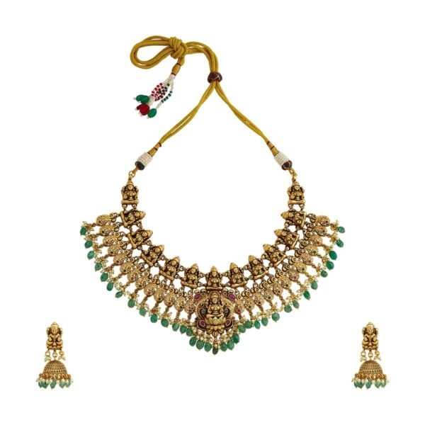 KUSHAL’S Fashion Jewellery Ruby-Green Gold Polished Antique Necklace With Push Back Jhumkas|Best For Bride, Bridemaids & Special Occasion | Antique Necklace Set For Women – 433029 – Fast Shipping to USA & Canada