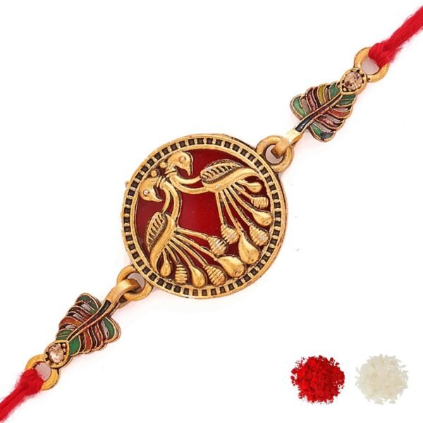 Voylla Designer Gold Toned Peacock Rakhi with Roli Chaawal Pack – Fast Shipping to USA & Canada