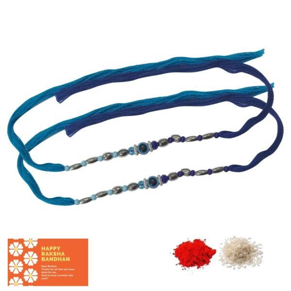 Shreyadzines Exclusive “Evil Eye” Beaded Blue Thread Rakhi Festival Special with Roli Chawal and Raksha Bandhan Note Card For Men – Fast Shipping to USA & Canada