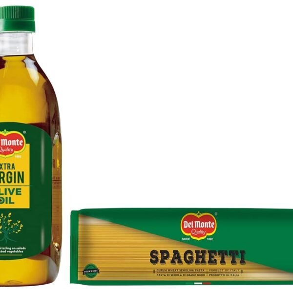 Del Monte Extra Virgin Olive Oil, Cold Extracted, Ideal for drizzling on salads & sauteed vegetables, 1L & Del Monte Spaghetti Pasta (Imported), 500 grams, No Artificial Flavours – Fast Shipping to USA & Canada