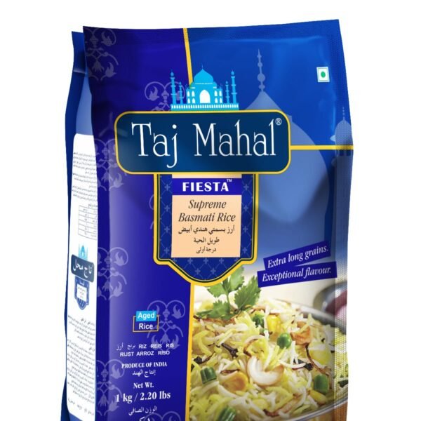Taj Mahal Fiesta Basmati Rice 1kg | Long-Grain Steam Basmati Rice | Fluffy & Non-Sticky Texture | Delicious Aroma & Taste | Naturally Aged | Durable Packaging – Fast Shipping to USA & Canada