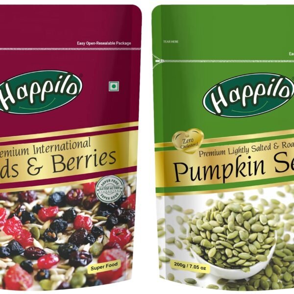 Happilo Premium Roasted Pumpkin Seeds for Eating 200g, Lightly Salted for Healthy Diet, Immunity Booster and Fiber Rich Superfood & Premium International Whole Seeds & Berries Pouch, 200 g – Fast Shipping to USA & Canada