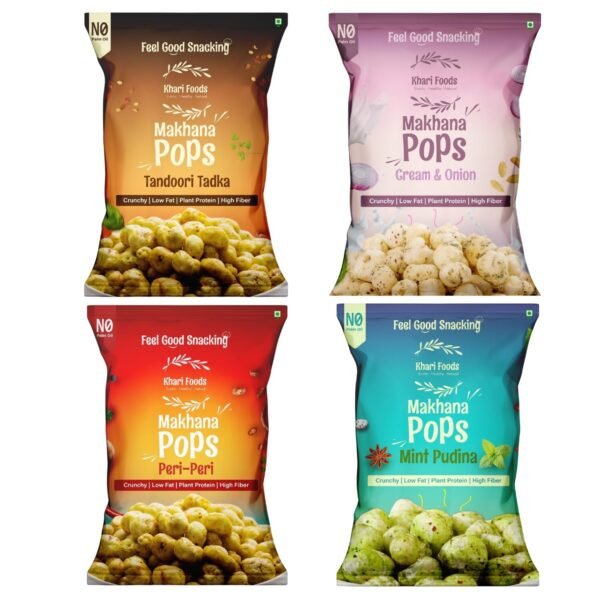 Khari Foods Premium Flavoured Makhana, 4 Flavours Combo, Crunchy & Roasted Makhana Pops, Protein Source, Fibre Rich, No Palm Oil, Gluten Free (25g x 4) – Fast Shipping to USA & Canada