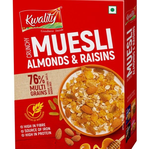Kwality RCB Muesli Crunchy 400g | 76% Multi Grains with Almonds, Raisins & Honey | Natural Source of Vitamin & Iron | High in Protein & Fiber | Low Fat & Cholesterol-Free | Healthy Food & Breakfast Cereal | Endorsed by Royal Challengers Bangalore (RCB) – Fast Shipping to USA & Canada