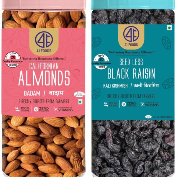 41 FOODS Premium Dry Fruits & Nuts Combo of Healthy Fresh Almonds Black Raisins | Nutritious Delicious Crunchy Badam Kali Kishmish (150Gm X 2) 300GM – Fast Shipping to USA & Canada