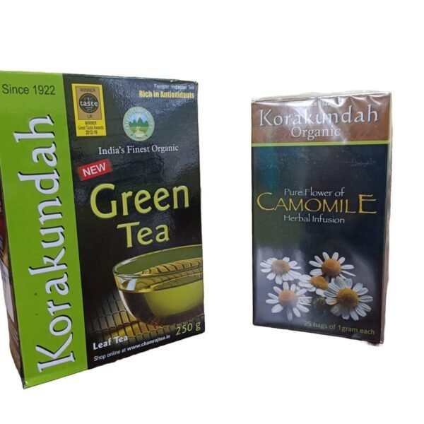 KORAKUNDAH Organic Green Tea 250 g | KORAKUNDAH Camomile Herbal Infusion 25 Dip Bags | Pack of 2 | Total 300g | India’s Finest Chamraj Nilgiri Tea – Fast Shipping to USA & Canada