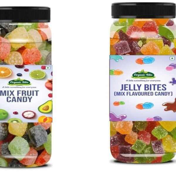 Organic Bites Combo of Colourful Jelly Bites and Mix Fruit Candy 200 gm each (Total 400 gm Jar Pack) – Fast Shipping to USA & Canada