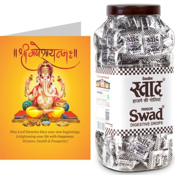 Swad Ganesh Chaturthi Gift with Card (Swad Digestive Candy 200 Jar & 1 Greeting card) – Fast Shipping to USA & Canada