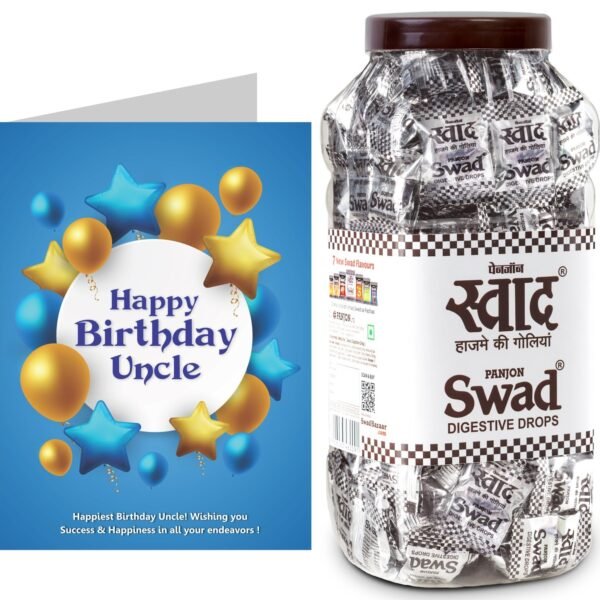 Swad Happy Birthday Uncle Gift with Card (Swad Digestive Candy 200 Jar & 1 Greeting card) – Fast Shipping to USA & Canada