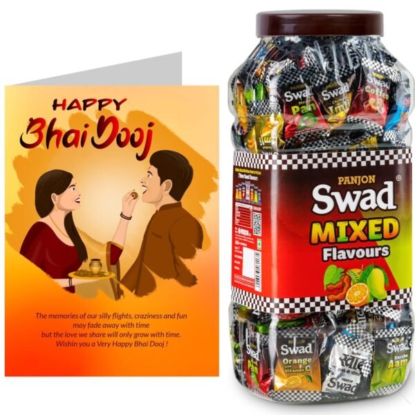 Swad Happy Bhai Dooj Bhaidooj Gift with Card (Swad Mixed Flavours Candy 200 Jar & 1 Greeting card) – Fast Shipping to USA & Canada