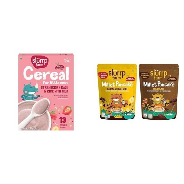 Slurrp Farm Baby Cereal Ragi Rice and Strawberry with Milk 200g & Instant Breakfast Millet Pancake Mix Banana Choco-Chip Supergrains and Chocolate 150g – Fast Shipping to USA & Canada