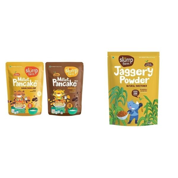 Slurrp Farm Instant Breakfast Millet Pancake Mix Banana Choco-Chip Supergrains and Chocolate 150g Pack of 2 & Slurrp Farm Natural Jaggery Powder 300g – Fast Shipping to USA & Canada
