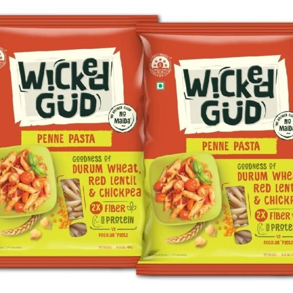 WickedGud 2X Fiber Penne Pasta | No Maida | Durum Wheat Semolina | Brown Rice | Red Lentils | Healthy Diet Pasta – 400gm x 2 – Fast Shipping to USA & Canada
