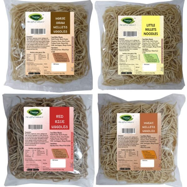 Thanjai Natural Millet Noodles 180 Grams X 4 Varities (720 G) Of Homemade Natural Horsegram|Red Rice|Little & Wheat Millets Noodles(No Preservatives, No Chemicals, No Artificial Extract) – Vegetarian – Fast Shipping to USA & Canada