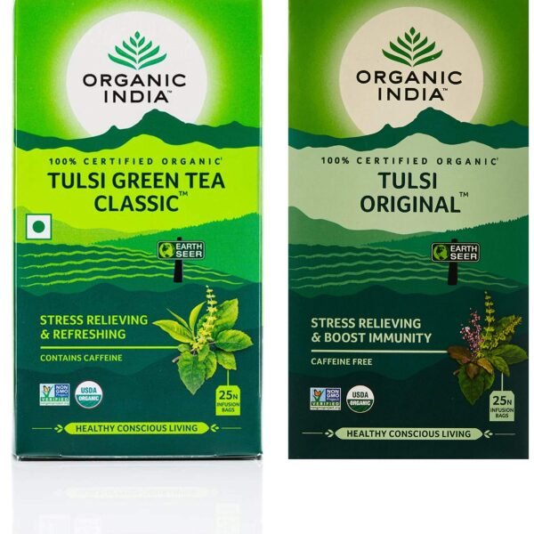 Organic India Tulsi Green Tea Classic – 25 Tea Bags + Organic India Tulsi Original Tea, 25 Infusion Tea Bags – Fast Shipping to USA & Canada