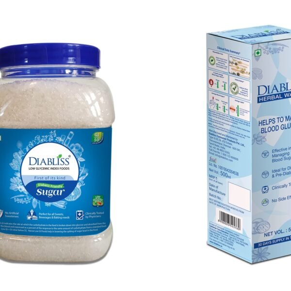 Diabliss Diabetic Friendly Herbal Cane Sugar – Free from Chemicals/Artificial Sweeteners – Low Glycemic Index (GI) – 1Kg Reusable Jar (1kg & Blood Glucose Management Herbal Water)