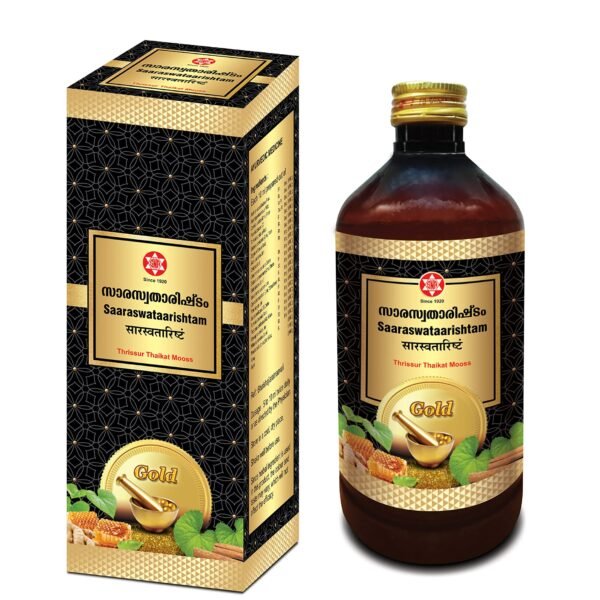 Thrissur Thaikat Mooss? S N A Saaraswataarishtam with GOLD – 450ml (To promote intelligence/memory) – Fast Shipping to USA
