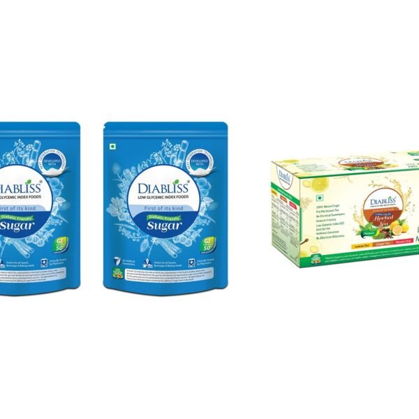 Diabliss Herbal Sugar & Tea Premixes Combo – Sugar 500g Pouch Pack of 2 & Lemon, Ginger, Masala(30x10g Sachets) – Low Glycemic Index (GI) Diabetic Friendly