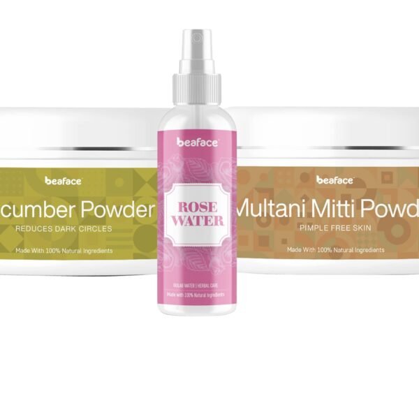 Beaface Combo Pack Cucumber Powder Under Eye Facial – 100gm | Multani Mitti Powder Acne Remover – 100gm | Rosewater Smooths Glowing Skin 100ml (Pack of 3)