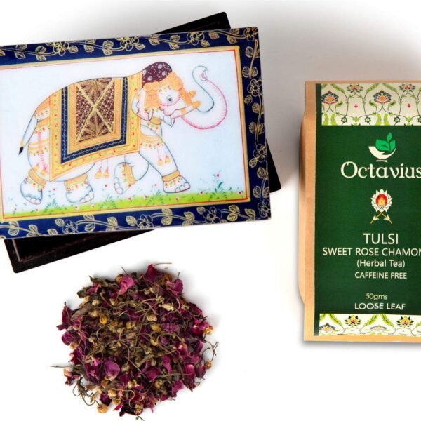 Octavius Tulsi Rose Chamomile Tisane Whole leaf tea in Darkwood Handcrafted Wooden gift box with Traditional Indian Elephant Pattern On The Lid | Caffeine Free | – 50 Gms (50 Servings) – Fast Shipping to USA & Canada