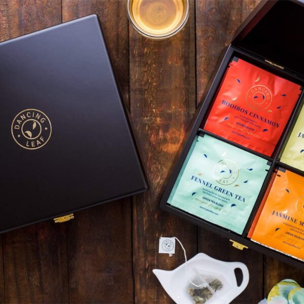 Dancing Leaf Wooden Chest | Great for Personal & Corporate Gifting | Rooibos Cinnamon, Fennel Green Tea, Jasmine & Mandarin, Kashmiri Kahwa | Assorted Blends | 24 Tea Bags (6 count each) – Fast Shipping to USA & Canada