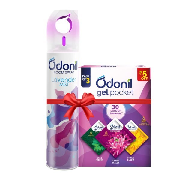 Odonil Spray & Gel Block Combo : Odonil Room Air Freshner Spray, Lavender Mist – 220 ml + Odonil Gel Pocket Mix – 30g (Assorted pack of 3 new fragrances) | For Home & Office | Long Lasting Fragrance – Fast Shipping to USA & Canada