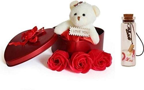 JaipurCrafts Artificial Heart Shaped Box and Teddy and Roses and Massage Bottle (Red, 1 Teddy, 3 Fragrant Rose Bud Petal Soap, 1 Heart Shape Tin Box, 1 Message Bottle) – Fast Shipping to USA & Canada