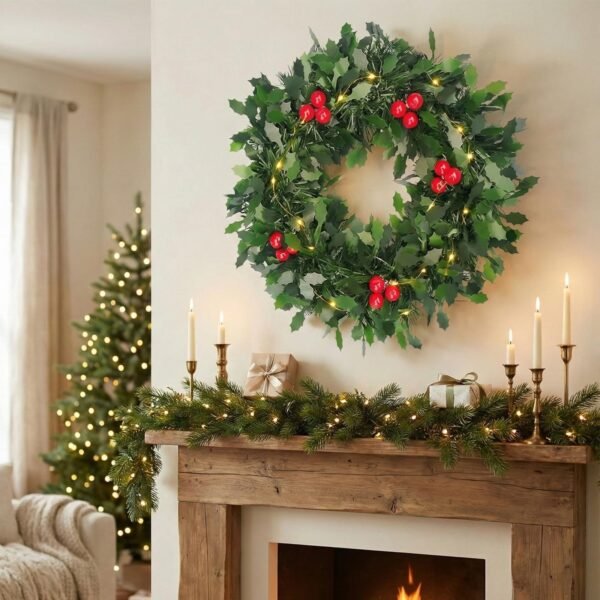 CraftVatika Christmas Wreath with Lights, Christmas Tree Decoration Items, Green Round Wreath Red Berries with LED Lights for Front Door Church Decoration Xmas Decor Items, Xmas Gifts Wreath for Wall – Fast Shipping to USA & Canada