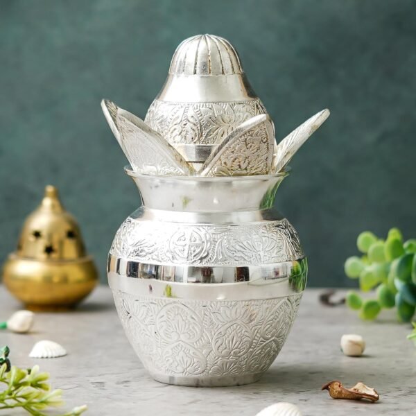 Webelkart Antique Sliver Plated Pooja Kalash with Coconut for Pooja Decor with Red Velvet Box/Swastik Kalash for Puja Temple/Diwali Gift Item/mangal Kalash (5″ inches) – Fast Shipping to USA & Canada