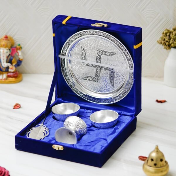 Webelkart Silver Plated Swastik Pooja Thali Set with Velvet Box for Diwali Poojan/Pooja Room/Diwali Gifting |ReturnGift,Thali Set for Puja (Silver) – Fast Shipping to USA & Canada