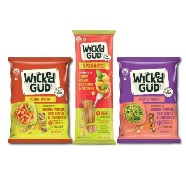 WickedGud 2X Fiber Spaghetti, Penne & Fusilli Pasta Combo | No Maida | Durum Wheat Semolina | Brown Rice | Red Lentils | Healthy Diet Pasta – 400gm x 3 – Fast Shipping to USA & Canada