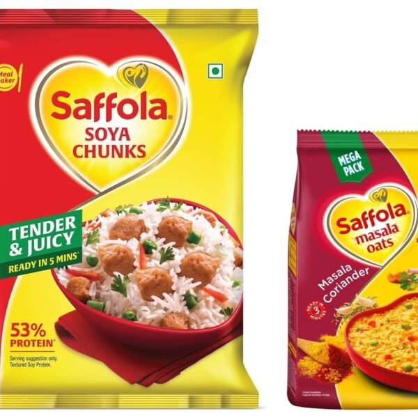 Saffola Masala Oats, Tasty Evening Snack, Veggie Twist, 500G & Saffola Mealmaker Soya Chunks With Supersoft Technology, Tender & Juicy, 1 Kg (Pouch) – Fast Shipping to USA & Canada