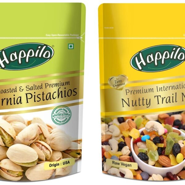 Happilo Premium Californian Roasted and Salted Pistachios, 200g & Premium International Trail Mix, 200g – Fast Shipping to USA & Canada
