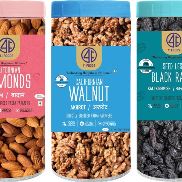 41 FOODS Premium Dry Fruits and Nuts Combo Healthy Fresh Almonds Walnuts Black Raisins Nutritious Crunchy Badam Akhrot Kali Kishmish 200Gm X 3 600Gm – Fast Shipping to USA & Canada
