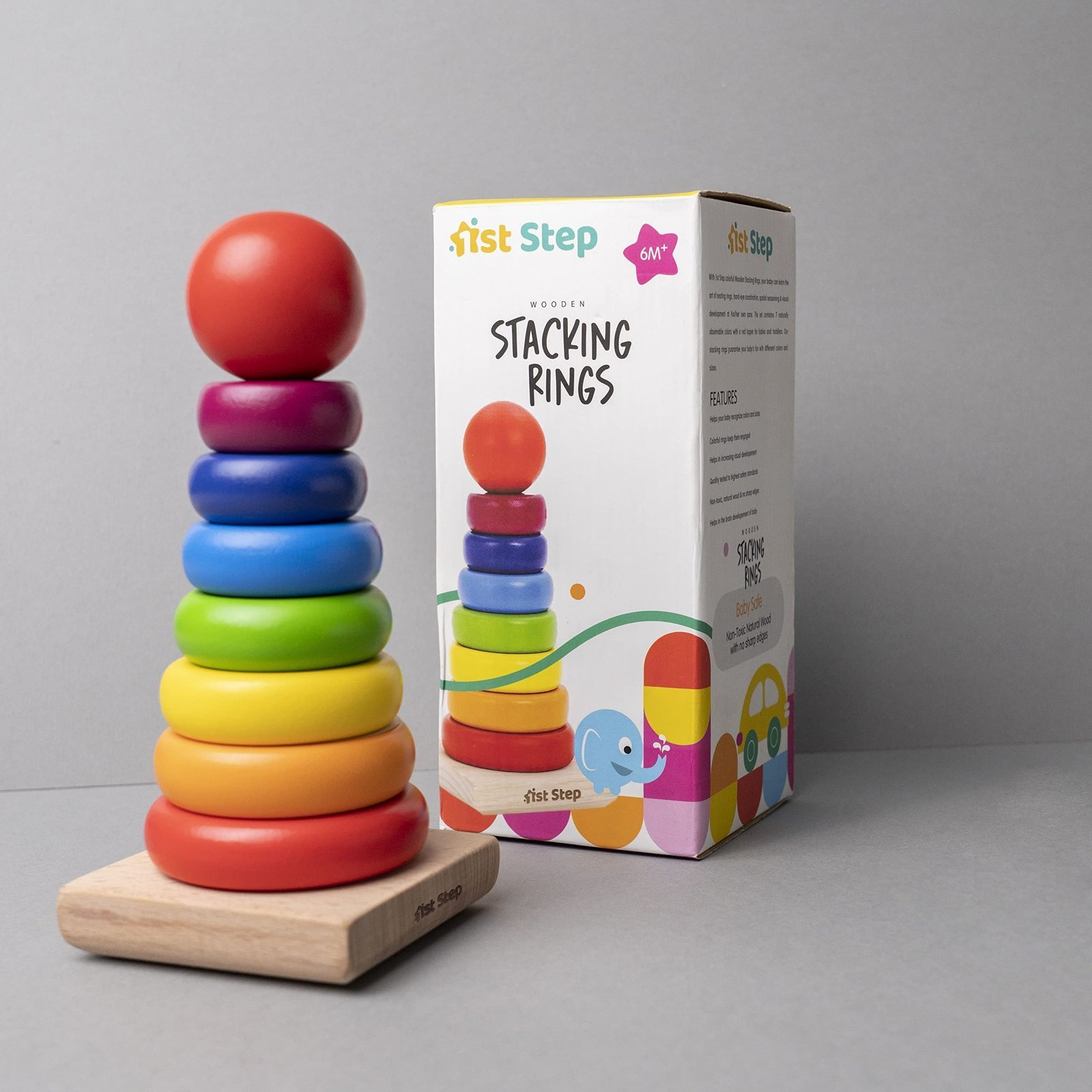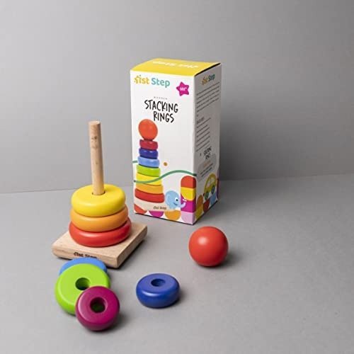 With 1st Step colorful wooden staking rings, your baby can learn the art of nesting rings, hand-eye coordination, spatial reasoning & visual development at his/her own pace. The set contains 7 naturally observable colors with a red topper for babies and toddlers. Our staking rings guarantee your baby’s fun with different colors and sizes.