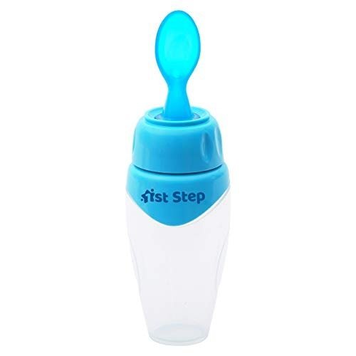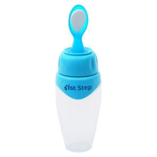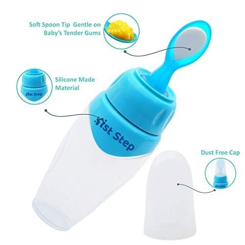 1st Step Non-Spill Soft Squeezy Silicone Cereal Feeder with Hygienic Spoon Cover – Blue – Fast Shipping to USA & Canada