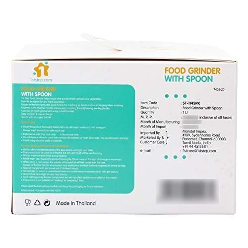 1st Step Food grinder helps to easily and quickly mash up fruits and vegetables.Ridges in the bowl provides good friction for mashing up food and avoid slipping when mashing. Grooves in the masher handle ensure even mashing & avoid leaving any big chunks. Can use as feeding bowl with easy to hold handle. Easy to clean & use on the go. Contains Spoon with easy grip handle.