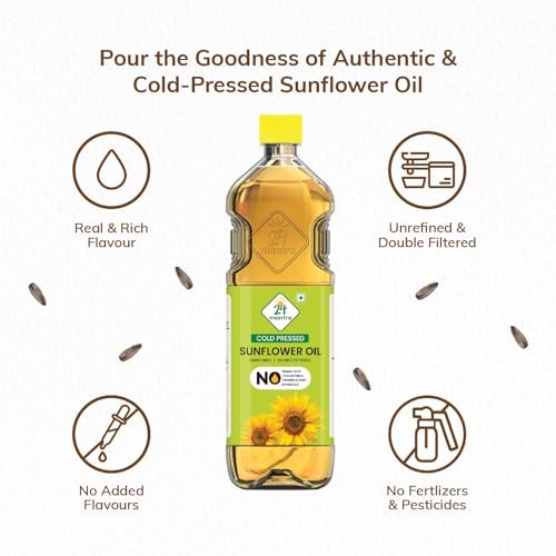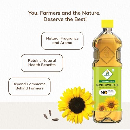 Edible vegetable oils serve as a vital source of energy, essential fatty acids, and fat-soluble vitamins in our nutrition. Sunflower seeds are particularly rich in oil, containing approximately 40?50%. Pressed sunflower oil ranks as the fourth most widely utilized oil globally. It is more stable compared to many other vegetable oils, making it a popular choice for culinary applications. Recently, pressed sunflower oil has gained attention for its health advantages. Unlike refined oils, it is not subjected to high temperatures and contains no added chemicals. 24 Mantra Organic Pressed Oils represent the purest form of oil available. The 24 Mantra Organic Pressed Sunflower Oil is extracted by pressing sunflower seeds, followed by a filtration process.