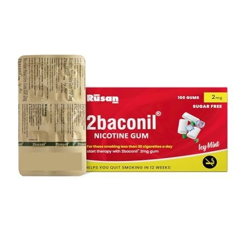 - A box containing 100 pieces of Rusan 2baconil Sugar-Free Nicotine Gum, 2mg strength, designed to support smoking cessation. These White Ice Mint-flavored gums utilize dual-coating technology to deliver an invigorating burst of minty freshness with each chew.