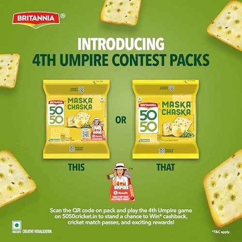 Britannia 50-50 Maska Chaska Salted Biscuits: A delightful tea-time treat infused with the richness of butter and seasoned with select herbs. These biscuits are crunchy, crispy, and savory, delivering a delicate buttery taste. Savor them with your tea, complemented by other fresh and wholesome Britannia favorites such as Good Day, Tiger, NutriChoice, Bourbon, Milk Bikis, and Marie Gold.